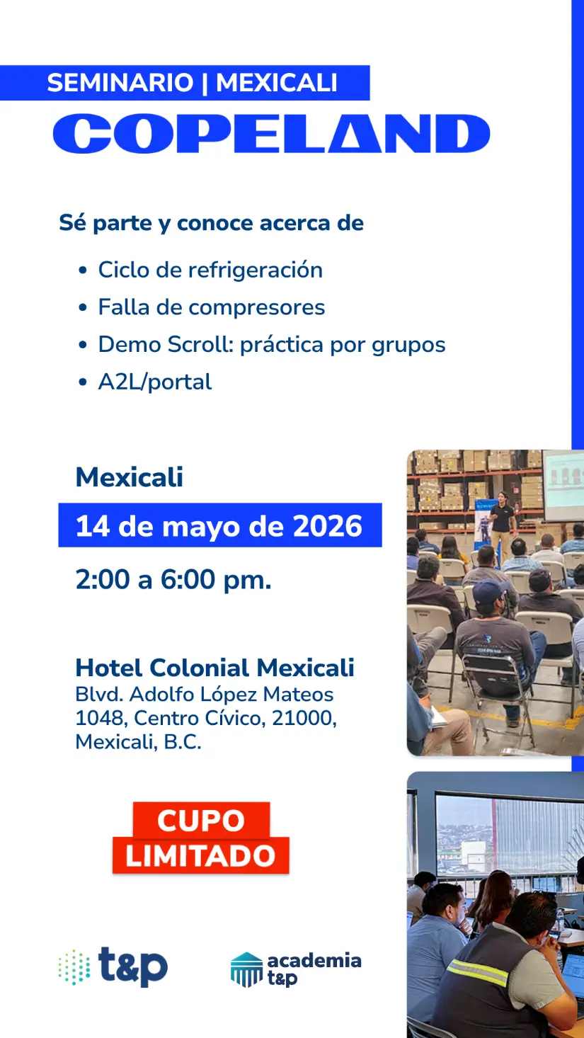 Técnicos y profesionales del frío: el Seminario Copeland en Mexicali llega el 14 de mayo. Práctica real, teoría actualizada y todo sobre refrigerantes A2L. Solo quedan lugares disponibles. ¡No te quedes fuera!
